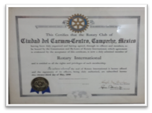 CLUB ROTARIO CIUDAD DEL CARMEN CENTRO recibe la Carta Constitutiva de Rotary International con número 27243, el 23 de mayo del 1990